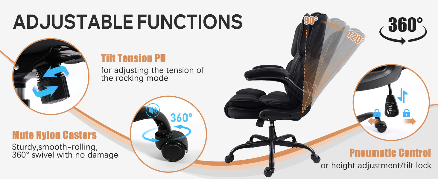 Tailor your seating experience to perfection with customizable features. Adjust the seat height to accommodate your individual needs, and recline effortlessly from 90 to 120 degrees for moments of relaxation. Enjoy seamless maneuverability with 360-degree rotation and smooth-rolling swivel caster wheels, making this chair the epitome of flexibility and convenience.